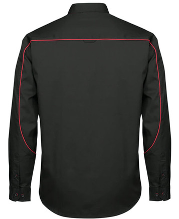 • Black long-sleeve button-up shirt featuring red piping and two chest pockets. Includes a logo on the chest.